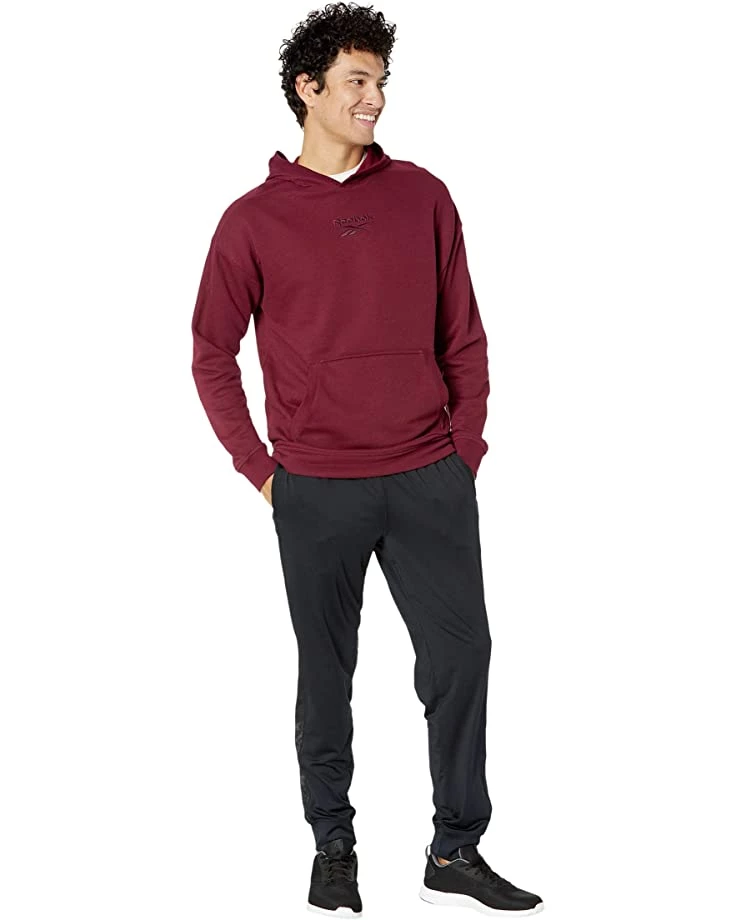 - Reebok® Training Essentials Melange Hoodie this men’s easygoing hoodie keeps your look simple and sporty, whether you’re hanging out or covering up after the gym. This hoodie features Reebok® lettering and logo in the middle chest area.
